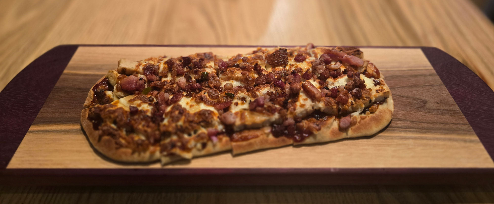 - BBQ Chicken – Chicken, red onions, mozzarella, and BBQ drizzle.